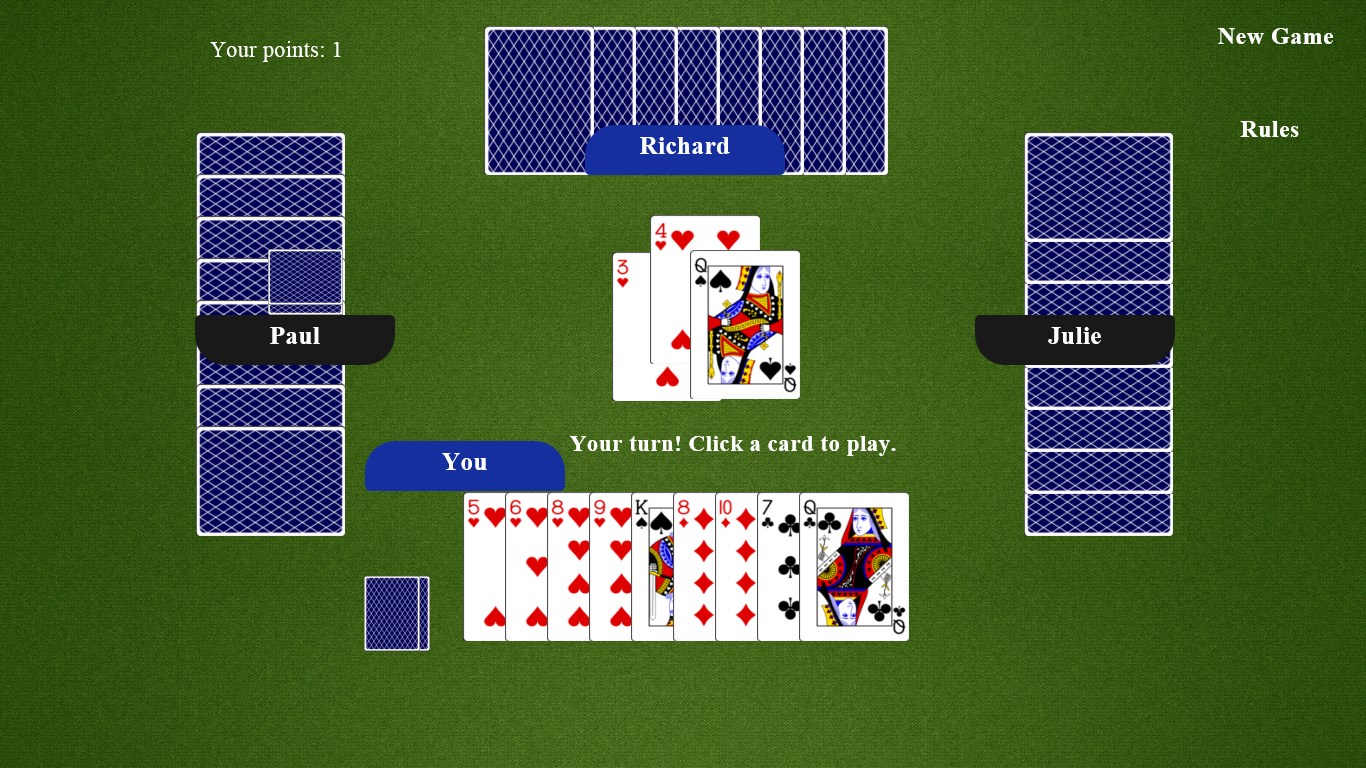 Welcome to hearts card game!, an amazing hearts game with stunning 3d graphics and backgrounds. Each heart taken in a trick is worth a point. During play, a heart can only be lead if the hearts have been broken, which occurs when a heart is played in a trick where another suit is lead. Can you defeat all of the card sharks that are waiting for you in this online version of the classic game? Play hearts card game for free in your desktop or mobile browser. Play the classic card game hearts online. Play your hand to avoid winning tricks. After looking at his or her hand, each player chooses three cards and passes them face down to another player. Hearts was a favorite game on mississippi riverboats after the civil war. With big and beautiful cards, a clear interface, hand picked sounds and an amazing artificial intelligence, hearts, the classic card game, offers you an experience like no other before. The object of the game is to either avoid taking tricks containing these cards, or to shoot the moon by capturing all of them. Fans of spades, bridge, & rummy will have a blast. With outstanding graphics and smooth animations, hearts classic provides hours of fun and entertainment for you and your whole family.